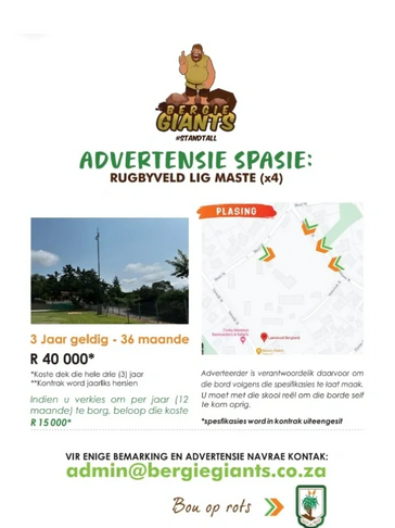 Want to support Bergie Giants We’re offering advertising space on the school Rugby field light masts to help raise funds for projects that benefit our students and school community!